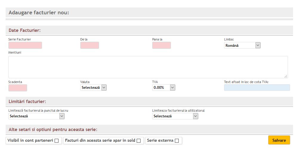 - se introduc datele pentru facturierul care va fi folosit (seria, numerotarea, scadența, valuta, cota Tva)